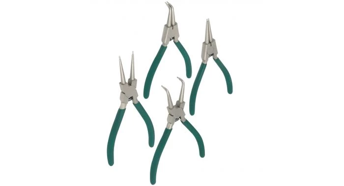 Couronne de verrouillage, 4 pièces. Pince avec poignée antidérapante, ressort interne et mâchoires nickelées polies, droites (180 mm) et incurvées (170 mm), pour circlips internes (selon DIN 472) et externes (selon DIN 471) de Ø 19 à 60 mm. Livré dans une cassette de stockage en plastique avec fenêtre de visualisation.