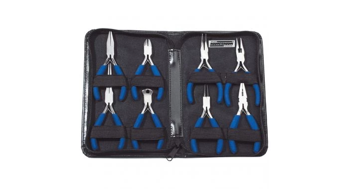8 mini-pinces avec poignée antidérapante, tête rectifiée et ressort interne dans un étui de rangement pratique.