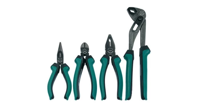 Pinces en langage noir poli, avec poignées à 2 composants et protection antidérapante pour une sécurité optimale. Pince mixte 180 mm, pince telephoto droite 160 mm, pince latérale 160 mm et pince pompe à eau 250 mm avec charnière filetée.