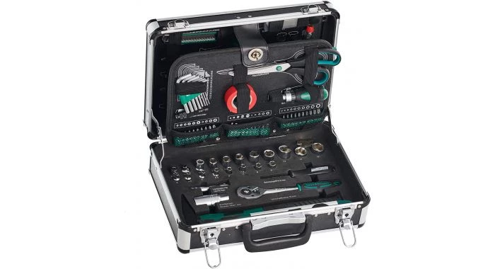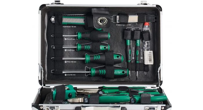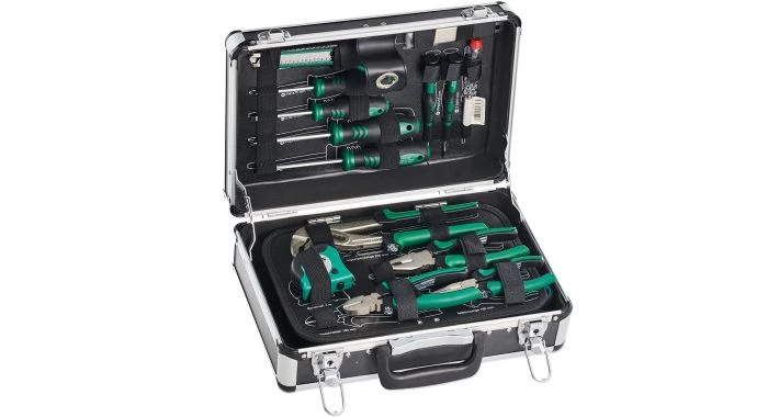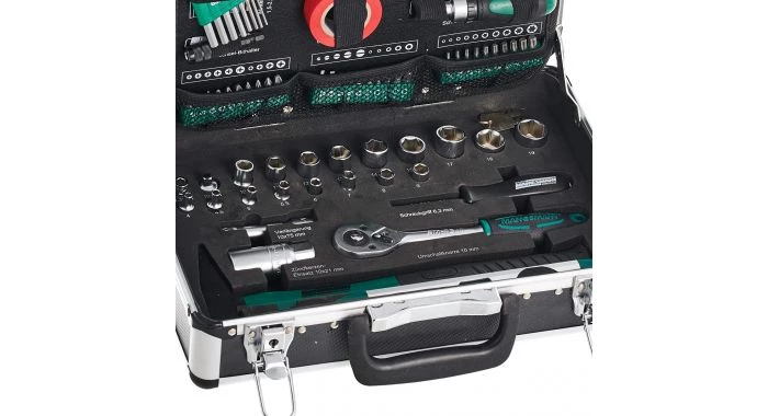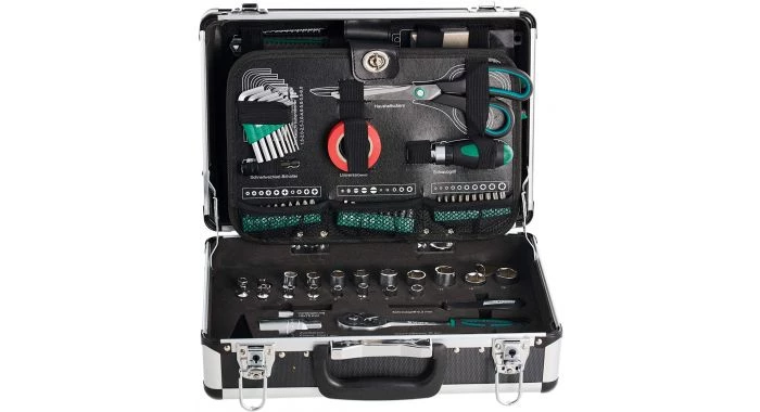 Coffret compact en aluminium contenant 90 outils à main Green Line, pour les professionnels et les bricoleurs.