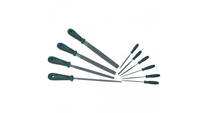Jeu de fichiers, 10 pièces. Limes d’atelier, 200 mm, double coupe, en triangle, rond, demi et plat et 6 trous d’aiguille, 90 mm, en triangle, carré, rond, hémisphérique, plat et bout plat.