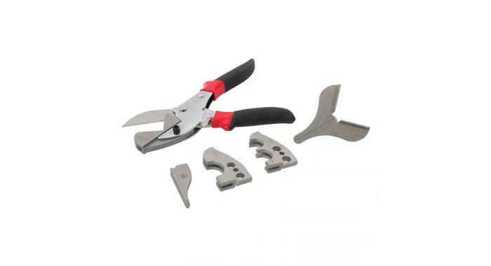 Solide lame et manches à revêtement PVC. Comprend 5 têtes permettant de couper divers objets en PVC profilé tels que entourages de fenêtre, cadres décoratifs et tuyaux de PVC. Avec attache de sécurité. Malette de rangement fournie.