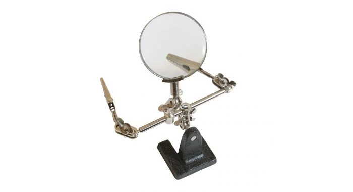 Appareil polyvalent permettant de tenir la pièce travaillée lors de l’assemblage, la soudure ou la peinture. Idéale pour le modélisme, l’électronique et l’artisanat. Comprend 2 bras entièrement réglables avec des pinces crocodiles, une loupe et une base robuste et stable. Lentille de 63 mm, 2,5x. Dimensions (H x L x l) : 170 x 185 x 49 mm. Poids : 0,3 kg.