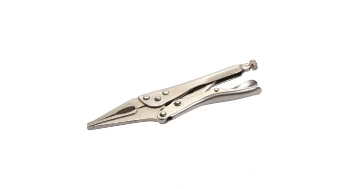 Pince autobloquante à long bec en acier nickelé. Mâchoires dentelées, ouverture réglable, manette de desserrage rapide.