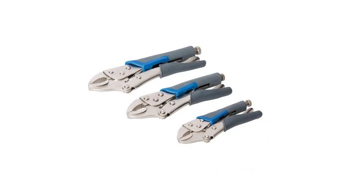 Pinces autobloquantes en acier nickelé à mâchoires incurvées. Ouverture réglable. Poignées caoutchoutées à levier de desserrage rapide. Tailles : 13, 17 et 21 mm.