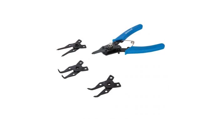 Pince en acier chrome-vanadium servant à la pose et au retrait de circlips internes et externes fournie avec 4 mâchoires interchangeables : deux droites, une à 45° et une à 90°. Poignées en polypropylène avec protections antidérapantes.